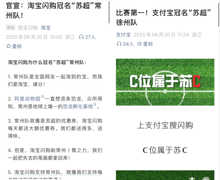 6月30日,江苏省城市足球联赛(以下简称“苏超”)再迎大厂“玩家”。淘宝闪购和支付宝前后脚宣布了对两支“苏超”球队的冠名,淘宝闪购冠名常州队,支付宝冠名徐州队,当日下午,花呗又宣布冠名无锡队,主打“无息”。三大阿里系品牌各自冠名,“散装阿里”呼应起“散装江苏”受到网友热议。