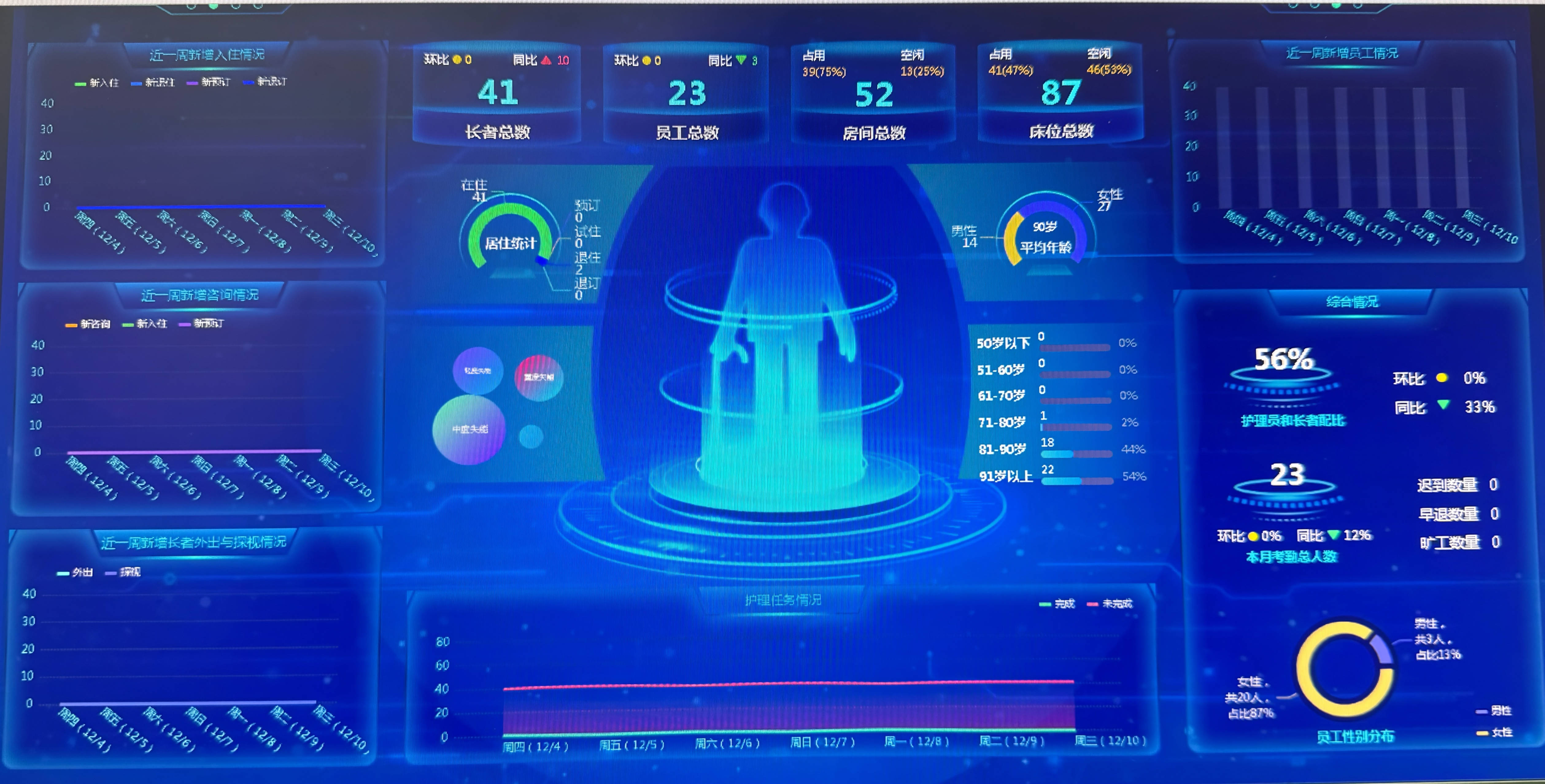 图为山东东营仁爱颐养院的智慧养老平台。新华社发在东营市德康宁医养中心,每位老人都佩戴了无线紧急呼叫设备。当老人按下呼叫键,护理人员可立即收到定位信息,还能通过双向语音了解现场情况。这些智能设备并非孤立存在,而是通过物联网技术接入医养中心智慧平台,形成一个完整的智能照护系统。平台对收集到的数据进行分析,评估老人的跌倒风险、睡眠质量、呼吸异常等健康状况,生成个性化照护方案。智慧巡房系统则会根据老人们的实时状态,自动为护理员生成最优巡房路线,让有限的护理资源发挥最大效能。